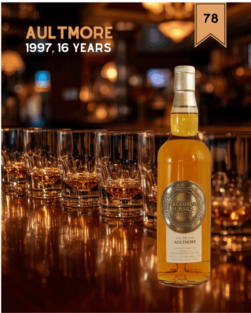 First things first: Distilled on 15 May 1997, this Aultmore was finished in a fresh American oak cask. The result was a yield of 298 bottles in the Exclusive Cask series.