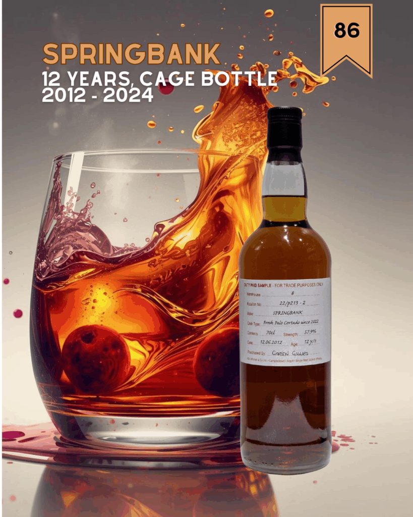 First things first: This Springbank was distilled on 12 June 2012 and matured until 2022, when it was transferred into a fresh Palo Cortado cask. It was then bottled on 7 November 2024 and put into the Cage at the Springbank Visitor Centre where it was at one point bought by me. Warehouse # 8 and rotation 22/p213-2.